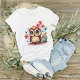 Charming illustration of a cute owl surrounded by pink flowers and tiny house. Features vibrant colors and heart patterns.