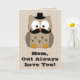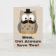 This cute little owl is so adorable with his black dressy hat and black handlebar mustache. I'll owlways love you on Mother's day. Great gift for the Mom who appreciates cute owls and animal cartoons with funny faces. Sandy brown background and brown owl with orange beak. All Designs Copyright © 2012 www.CuteComfy.com