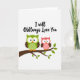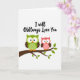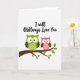This greeting card shows two cartoon owls sitting close together on a dark brown branch, set against a plain white background. The owl on the left is lime green with darker brown wings, light blue eyes, and a calm, steady expression. The smaller owl on the right is coral pink with brown accents, bright eyes, and a sweet, cozy look as it leans in. A few small green leaves are scattered along the branch, adding a simple touch of nature without pulling focus from the pair. At the top of the card, the message “I will OWLways Love You” is written in black script with smooth, flowing letters. The pun ties the picture and the message together in a cute, affectionate way that fits romance or close friendship. It feels like a warm little reminder of staying close and caring for someone special ❤️