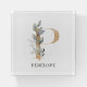 Letter P monogram floral. Letter P in golden brown texture accented with green watercolor compound leaves, flower blossoms and gold dust. Personalized with name in matching font.