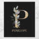 Letter P monogram floral. Letter P in golden brown texture accented with green watercolor compound leaves, flower blossoms and gold dust. Personalized with name in matching font.