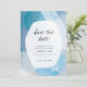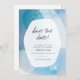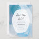 This unique save the date features abstract watercolor in teal-blue hues.