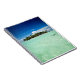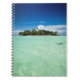 Notebook with a desert or uninhabited adventure Island with palm trees and a dark blue sky in the turquoise water of a lagoon in the Pacific archipelago French Polynesia.