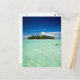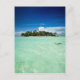 Vertical portrait postcard of a desert or uninhabited adventure Island with palm trees and a dark blue sky in the turquoise water of a lagoon in the Pacific archipelago French Polynesia