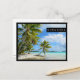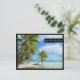 Postcard with a hanging palm tree on a white sand beach on a small desert island in the blue lagoon of tropical Rangiroa, an atoll near Bora Bora in the Tahiti archipelago French Polynesia in the Pacific ocean with a black border and the text: 'Bora Bora'.