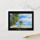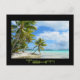 Postcard with a hanging palm tree on a white sand beach on a small desert island in the blue lagoon of tropical Rangiroa, an atoll of the Tahiti archipelago French Polynesia in the Pacific ocean with a black border and the text: 'Tahiti'.