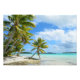 Photo print of a hanging palm tree on a white sand beach on a small desert island in the blue lagoon of tropical Rangiroa, an atoll near Bora Bora in the Tahiti archipelago French Polynesia in the Pacific ocean.