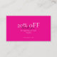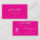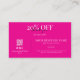 A modern discount business card designed for small business owners. Includes space for a thank you message, QR code, social media details, and branding information, making it perfect for packaging inserts and order thank you cards. A clean and customizable design that helps strengthen customer relationships, support repeat purchases, and create a bold branded presentation in hot pink.