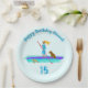 Paddleboarding party for girl, paper plates with customization. Stand-up paddle-boarding design is my own graphic illustration. A young girl takes her brown dog for a ride in tropical water as a sea turtle swims by. Add her name with "happy birthday" curved around the top of the plates. Age can be added beneath the design. Plates come in two sizes.