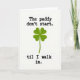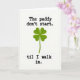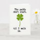 This greeting card features a bright four-leaf clover centered on a white background, with emerald leaves shaded for a softly rounded look 💚. Above the clover, the line “The paddy don’t start.” appears in black, slightly worn lettering, as if stamped with an old typewriter. Below the clover, “til I walk in.” sits on its own line in the same black style, giving the layout a confident, strutting rhythm. The clover acts like a cheerful divider between the two phrases, turning the words into a flirty entrance line you’d share with a close friend at the door ☘️. The wide white space keeps everything focused, making the green stand out against the dark text without any extra clutter. The two lines of text are horizontally centered and evenly spaced, framing the clover like a spotlight moment. The clover’s stem tilts slightly downward, with gentle shading along each leaf that adds depth against the plain white field.