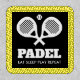Padel Eat Sleep Play Repeat custom iron on patch with racket logo. Cool design with crossed racket and ball design plus humorous quote. Add your own personalized text optionally. Fun clothing emblem for padel players, fans, coach, club trainer, team, party, event etc.
