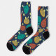 These fun patterned socks feature illustrations of padel tennis rackets and balls in teal, terra cotta, gold, yellow and cream against a navy blue background.