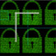A cool computer style padlock made up of tiny binary code characters. The ideal cyber or infosec theme for a digital business or computing enthusiast which will make an impact with its retro green on black.