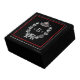 This jewelry keepsake box is shown in black color with a sleek black background and a royal looking emblem of a silver-color wreath and crown in center surrounded by a slim border in coordinating color, shown in red and all are printed on top. Pre-formatted text to for you to personalize your monograms. Sample text shown.