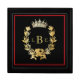 This jewelry keepsake box is shown in black color with a sleek black background and a royal looking emblem of a gold-color wreath and crown in center surrounded by a slim border in coordinating color, shown in red and all are printed on top. Pre-formatted text to for you to personalize your monograms. Sample text shown.