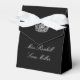 Party favor box shown in black with a white ribbon bow and with a pageant crown print.
