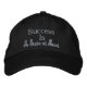 Shown in Black cap with the embroidered texts in blue and silver Isacord. This cap has front text only. Adjustable back.