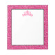 Notepad shown with a fun faux pink glitter border edges and a single medium-large sized pink colored tiara crown at the top. White space in center for you to jot down your messages.