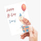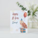 Paint cute barn owl with hat, balloon and gift. Happy birthday Postcard.