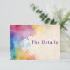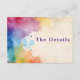 Make attending your wedding easy and joyful with this “The Details” enclosure card, featuring bright watercolor paint splashes for a modern, artistic touch. Designed for effortless RSVP management, this card combines elegant wedding stationery with a playful, inviting look that helps guests quickly confirm their attendance. The vibrant watercolor artwork brings a sense of celebration and fun, while all your event details are displayed clearly for convenience. Perfect for couples seeking a time-saving solution that’s both stylish and lively, this insert ensures your RSVP process is smooth, memorable, and full of personality.