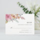 Elegant floral RSVP card in muted tones of pink, peach and sage greens features a watercolor floral peony bouquet at the upper left corner, with your desired RSVP date, accept and decline wording in classic off-black lettering.