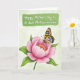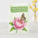 This design shows a large soft-pink flower with many layered petals filling the lower part of the card, like a gentle bloom opening for someone special ❤️. At its center, warm golden-yellow stamens glow like a small sun, drawing your eye inward. Resting there is a winged insect with wide wings patterned in bright yellow, deep black, and clear blue, posed as if it’s pausing in quiet admiration. The background is a pale sage green wash that feels like early spring air, giving the scene an easy, affectionate calm. Near the top, a painted banner in a deeper, textured green stretches across, adding a cozy frame for the message. The message text sits on that banner in a flowing, hand-painted style, standing out clearly and reading like a note shared between close friends 🌼. Fine details show in the soft shading of the petals and the crisp markings on the wings, with the banner’s edges slightly uneven like brushstrokes. The flower’s golden center sits just below the insect, while the green banner and its dark lettering hover above in the upper third.