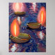 Painting of lit deepas floating and reflecting on water.