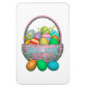 Colorful painted Easter eggs in a pretty basket with a banner that says "Happy Easter".