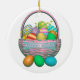 Ornament with my artwork of painted Easter eggs in a pastel basket with text that says "Happy Easter".