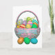 Cheerful card with my image of colorful painted Easter eggs in a pretty basket with a banner that says "Happy Easter". Verse inside.