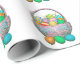 Wrapping paper with my design of colorful painted Easter eggs in pretty baskets with text that says "Happy Easter".