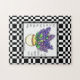 A challenging puzzle with a black & white checkerboard background. Painted flowers (purple hyacinth) in vase, with verse from Psalm 118:24