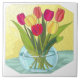 A brightly floral tile of painted flowers; yellow and red tulips in a bowl of water. Perfect accessory to add a splash of color to your kitchen (or any other room in the house!) Use as a trivet, or a piece of art.
