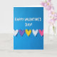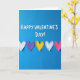 This design shows a bright azure background that sets a cheerful stage for a Valentine’s greeting, with “HAPPY VALENTINE’S DAY!” placed across the top in rounded white sans‑serif letters. Beneath the text, five painted hearts line up like a small parade, giving the scene a sweet, friendly rhythm 🥰. The hearts look like cut paper or light cardstock, and their visible brushstrokes make them feel touched by someone who cared. From left to right the colors read as white, purple, sunny yellow, white again, and hot pink, each one slightly different as if made for a group of close friends or a couple sharing a grin ❤️. A slightly uneven blue outline traces every heart, tying them together and adding a gentle hand-drawn feel. The open space around the shapes keeps the layout airy, so the message at the top stays easy to read. The five hearts sit in a neat row under the white headline, each edged in the same blue line against the solid azure field.