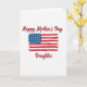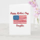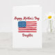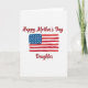 This greeting card features a white background that makes a red, white, and blue banner-style emblem stand out at first glance. Across the center, horizontal red stripes look like textured paint strokes, giving the design a soft, lived-in look that feels close and affectionate ❤️. In the upper left area of the emblem, a deep blue rectangle holds small white star-like shapes arranged in neat rows with slight variation, like tiny lights scattered with care. Above the emblem, the words “Happy Mother’s Day” appear in flowing red lettering, centered and spaced to feel airy and open. Below the emblem, the word “Daughter” is placed in the same red lettering, centered, adding a gentle family connection without crowding the artwork 👩. The roomy white space around the design keeps the focus on the tender message and the calm, classic colors. The red text sits above and below the emblem, with the blue field and white stars tucked into the top-left corner of the striped shape.