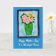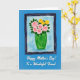Designed with a dark-outlined rectangular frame, the front centers on a bouquet arranged in a deep green vase, like a small gift set aside for someone dear ❤️. Inside the frame, several soft pink, many-petaled blooms take the lead, leaning gently toward one another as if sharing a quiet moment of friendship. Bright yellow, daisy-like flowers peek through the pink blossoms, tucked among lively green leaves that spill outward with an easy, relaxed grace. The vase sits on a pale blue tabletop, and the light blue background behind the flowers is brushed softly, giving the scene an airy, springtime feel 🌼. Outside the framed illustration, the card face shifts to a deeper blue, making the lighter center look like a window into a calmer space. Along the bottom, a message in white lettering reads “Happy Mother’s Day! To a Wonderful Friend.” The pink blooms and yellow daisies stand out crisply against the sky-blue panel within the dark border.