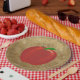 A painting of a whole red apple with yellow highlights and a green leaf is printed on a painting of gold glitter sparkle look background, and is printed on paper plates. Thank you for shopping CherylsArt on Zazzle.