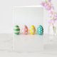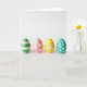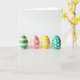 This card features four decorated egg shapes lined up across the lower part of a bright white background, like a small group gathered close as friends 🌷. Soft, diffused light falls evenly across them, showing gentle paint texture and leaving faint shadows beneath each one. On the far left, the first egg is striped with medium green and white bands, giving it a tidy, graphic look. Next to it sits a light pink egg sprinkled with uneven white dots, adding a relaxed, friendly tone 🐰. Near the center, a sunny yellow egg stands out with a large white flower design, its petals drawn wide and open with a few extra white dots around it. On the right, an aqua-teal egg repeats the dotted pattern in white, balancing the row with a cooler color. The greeting text appears above the eggs in small, light gray lettering centered near the top. Four eggs sit evenly spaced in a straight line, with the yellow floral one slightly drawing the eye in the middle.