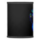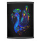Bright blue body with colorful feathers against black creates a single funky bird.