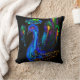 Bright blue body with colorful feathers against black creates a single funky bird.