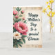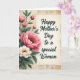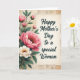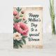 Designed with a lush bouquet on the left, the card features a large soft-pink flower with many petals and a warm amber-and-crimson center that draws the eye. Nearby, small white blossoms with golden centers and a few pink buds peek out from deep green leaves, as if leaning close in a gentle, caring cluster ❤️. On the right, a cream parchment panel with torn, aged edges rests over a background of faded paper textures, giving the scene a quiet, keepsake feel. Centered on that parchment, the message reads “Happy Mother’s Day to a special Woman,” set in a flowing dark ink style that feels tender and affectionate. The words sit mostly in the middle with comfortable spacing, leaving room for the floral arrangement to “reach” toward the note like a warm embrace 🌼. Behind everything, layered antique-paper tones and faint, unreadable lines create depth without stealing attention from the main message. Soft, diffused lighting highlights the petal shading, the leaf veins, and the rough edges of the parchment. The background shows overlapping beige and tan papers with scattered, barely legible text fragments.