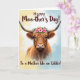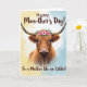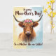 This card features a tall, vertical portrait of a shaggy long-haired cow facing forward, its reddish-brown coat filling most of the space as wavy strands part to reveal a calm, tender gaze that feels quietly affectionate ❤️. Upward-curving horns frame the head, giving the animal a gentle, steady presence, like it’s leaning in for a friendly moment. A soft, painterly background fades from creamy sunlit yellow on the left to pale sky blue on the right, keeping the scene light and airy. A crown of bright pink flowers and fresh green leaves rests across the forehead, adding a sweet, celebratory touch 🌼. The eyes, half-shadowed by the fringe, look warm and attentive, as if meeting someone’s glance with easy closeness. Any message text appears lightly placed within the open background area in a simple flowing style, using a dark tone that stays readable without overpowering the art. The lower part of the coat fades gently into the background, and the pink blossoms sit centered above the eyes with small green leaves fanning outward.
