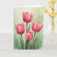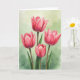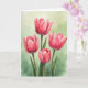 Designed with four tall spring flowers as the main focus, the artwork shows petals in shades of pink that deepen toward the centers and fade to a softer edge, like a gentle blush ❤️. The blooms are arranged in a close-knit group, with one larger flower near the top, two companions beside it, and a smaller bud tucked below, creating the feel of friendly closeness. Soft light falls across the petals, giving them a slightly see-through look and making their curved edges seem to lean toward one another. The background is a smooth wash of pale green that suggests a garden setting without sharp details, keeping the attention on the flowers. Rich green leaves and stems frame the pinks and add balance, like steady support around something tender. There is no visible text on the front, leaving open space around the blooms for a quiet, thoughtful look 🌼. Gentle shadows sit under the petals and along the stems against the misty green backdrop.