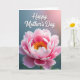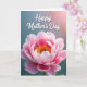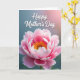 This card features a tall, vertical layout focused on one large flower in full bloom, filling the lower half like a tender offering ❤️. The many layered petals open outward in soft pink tones that deepen toward the center and fade to near-white along the ruffled edges, giving it a gentle, romantic softness. Near the middle, golden-orange stamens glow like a warm shared glance, adding contrast and a cozy sense of closeness. The lighting is diffuse and calm, with small highlights tracing the curves of the petals as if in a quiet, caring moment. Behind the flower, the background stays softly blurred, shifting from muted teal near the bottom to peach and soft amber toward the upper right, like early morning light 🌼. Near the top, the phrase “Happy Mother’s Day” appears in white, placed above the bloom so it feels like it’s floating in the open space. The letters sit centered against the lighter background, remaining easy to read without overpowering the flower. The blossom’s center shows a bright ring of golden-orange details surrounded by fuchsia-pink shading.