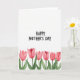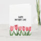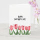 This card features the words “HAPPY MOTHER’S DAY” centered near the top in thick black lettering on a bright white background, setting a warm, affectionate tone ❤️. The text sits comfortably in the upper half, leaving plenty of open space that feels calm and airy. Along the bottom edge, five spring-like flowers line up in a neat row, like a gentle bouquet offered with care. Their closed petals are painted in soft pink tones that shift from pale blush to deeper rose toward the folds, giving them a tender, romantic look. Slender green stems and broad leaves stretch upward, adding fresh contrast and a natural balance to the pinks. The overall style looks like light watercolor washes, with slightly feathered edges that make the flowers feel soft and close. A faint paper-like texture shows through the white areas, and the petals have delicate painted borders 🌼.