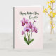 This design shows a centered bouquet of orchid-like flowers painted with soft, layered shading that feels gentle and romantic ❤️. The petals fade from pale lavender and blush pink into fuchsia and deep purple, with tiny touches of golden yellow tucked into the flower centers like a quiet secret shared between close friends. Slender green stems rise from the bottom with one broad leaf, giving the arrangement a grounded, natural base. The background stays light and airy, shifting from blush pink near the edges to creamy white toward the middle, like a soft glow behind the blooms. Near the top, a short message sits above the flowers in flowing deep green lettering, balanced and easy to spot without crowding the artwork. The lighting looks diffused, making the petals appear slightly translucent and adding a calm, affectionate mood 🌼. Fine veining and darker purple shadows define each blossom, while the green stems taper upward in thin lines beneath the centered cluster.