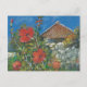 A watercolor painting postcard of hibiscus and a traditional Okinawan House