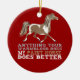 For those who like a little color in their horses, this paint horse design features the image of a brown and white paint horse trotting with text that says "Anything your warmblood does, my paint horse does better!"