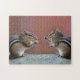 Two little sitting on a rock. One is eating an acorn and the other is washing his face.
