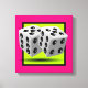 An illustration of a pair of white dice with black dots. Background is created with some groovy psychedelic neon colors in lime green and fuschia pink.